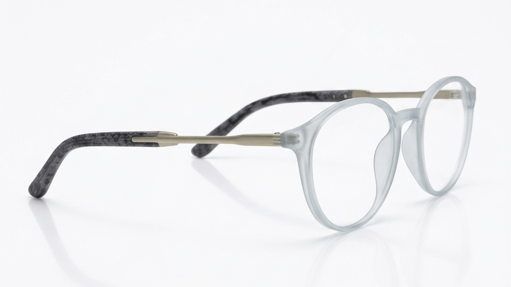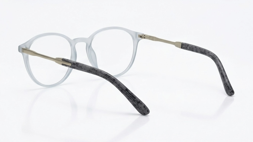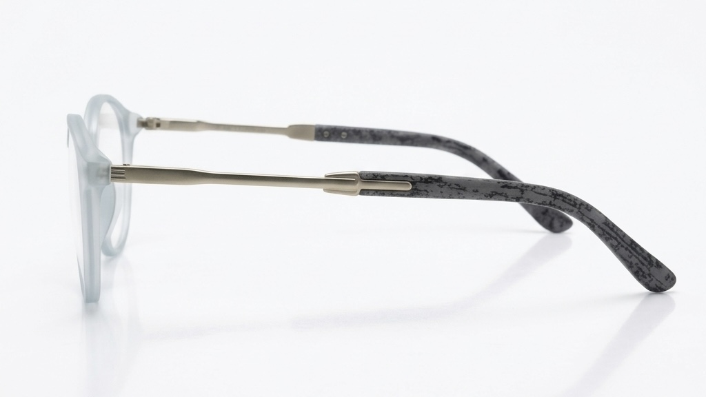 Elevate your look with our meticulously crafted matte blue P3 spectacles, a timeless frame shape redefined for the modern aesthetic. This frame features a sophisticated, matte finish in a subtle blue hue that is both professional and effortlessly cool. Designed with a thin profile and keyhole bridge, it offers an exceptionally light and comfortable fit for all-day wear. The design is punctuated by sleek, brushed gold metal segments on the temples, which provide a touch of refinement and structural elegance. For a striking visual contrast, the temple tips feature a unique, textured black and grey patterned acetate, creating a complex, premium feel. This exquisite fusion of high-quality, lightweight materials and thoughtful, detailed design makes this frame a unique and stylish choice for the discerning individual.
